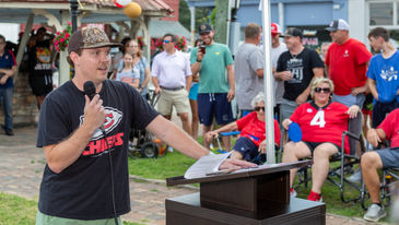 During the 2022 FHF Club Pageant Super Bowl Champion Mecole Hardman, Jr. was recognized for helping the organization generate over $37,000 in the last two years. Jeff Adams presented Mecole with an FHF Outstanding Friend plaque in appreciation of his ongoing support to Friends Helping Friends Club, Inc.